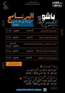 تنظم دار الثقافة بوعرقوب تحت اشراف المندوبية الجهوية للشؤون الثقافية بنابل وبالتعاون مع مركز الفنون الدرامية و الركحية بنابل ” أيام باشو للمسرح” – الدورة الثانية