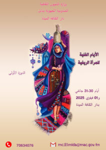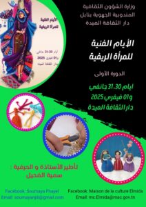 تحت اشراق المندوبية الجهوية للشؤون الثقافية بنابل تنظم دار الثقافة الميدة الدورة الاولى من تظاهرة “الأيام الفنية للمراة الريفية “وذلك أيام 30-31جانفي