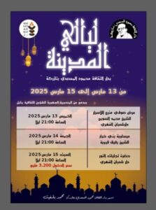 تنظم دار الثقافة محمود المسعدي بتازركة أيام 13و14و15مارس2025 مهرجان ليالي المدينة والذي يتضمن ثلاثة عروض من الموسيقى الصوفية والروحية تماشيا مع خصوصية شهر رمضان المبارك ، وسيكون افتتاح التظاهرة بالعرض الصوفي منبع الأسرار للشيخ محمد السويح يوم الخميس 13مارس ، ويكون مشفوعا بعرض عيساوية بني خيار للشيخ رفيق قروية يوم الجمعة 14مارس ويكون اختتام التظاهرة بوم السبت 15مارس بعرض تجليات النور دار شعبان الفهري