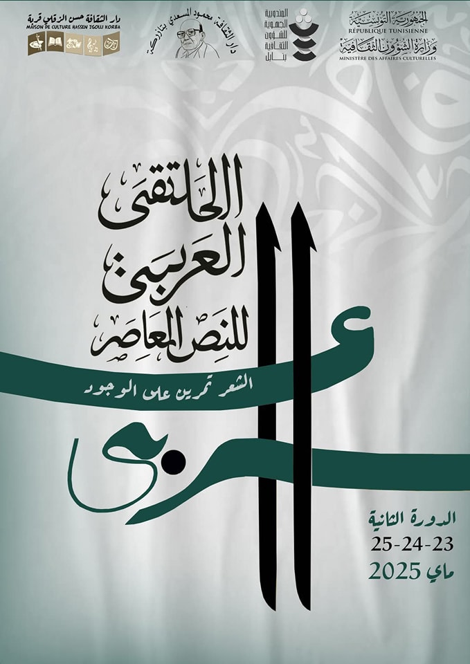 تحت إشراف وزارة الشؤون الثقافية وبدعم من المندوبية الجهوية للشؤون الثقافية بنابل، تنظّم كلّ من دار الثقافة حسن الزقلي بقربة ودار الثقافة محمود المسعدي بتازركة الدورة الثانية من الملتقى العربي للنص المعاصر أيام 23 و24 و25 ماى2025