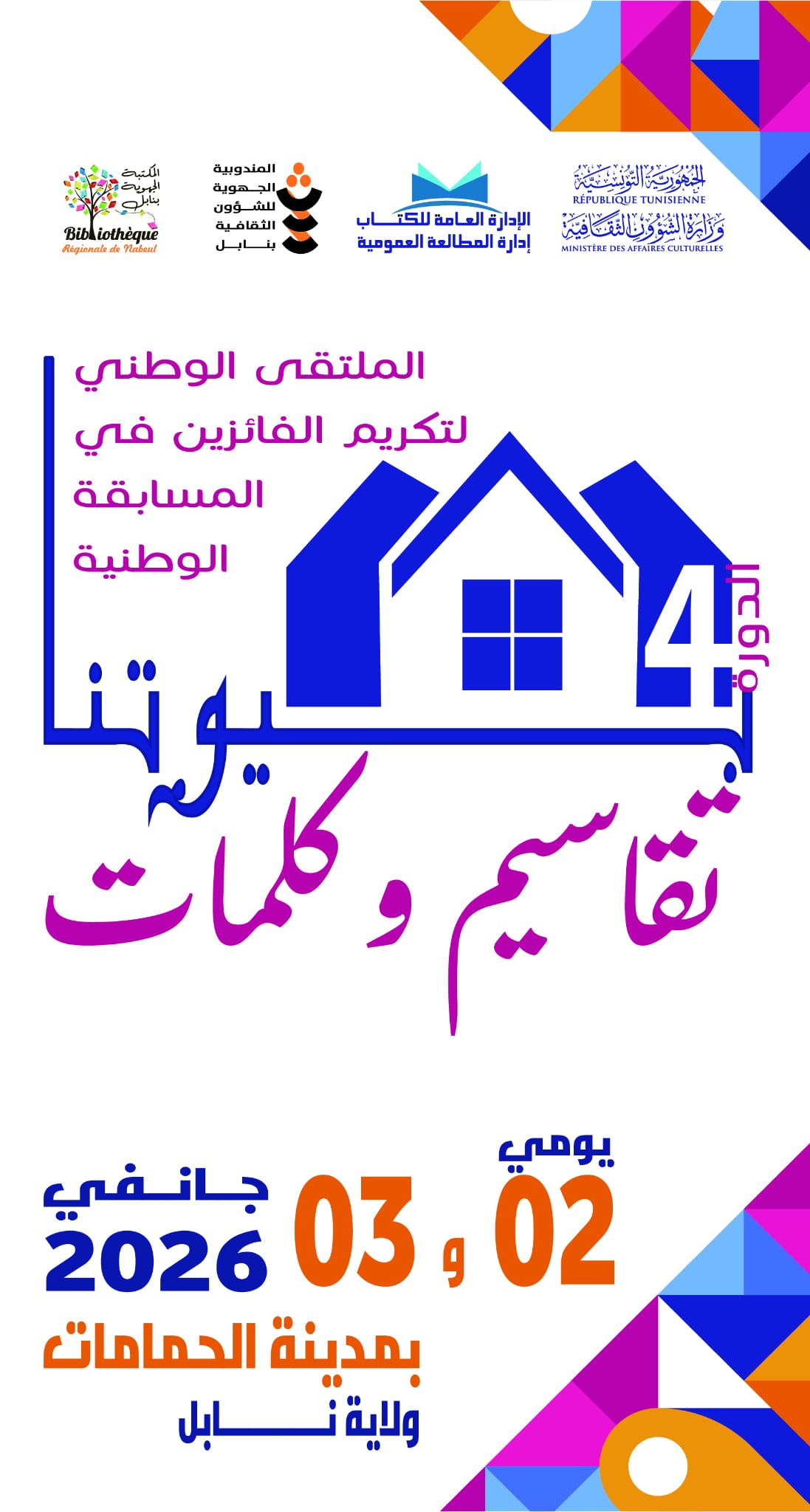 تحت إشراف وزارة الشؤون الثقافية تنظم إدارة المطالعة العمومية بالإدارة العامة للكتاب بالتعاون مع المندوبية الجهوية والمكتبة الجهوية بنابل الملتقى الوطني لتكريم الفائزين في المسابقة الوطنية “بيوتنا تقاسيم وكلمات” دورة 2025 بمدينة الحمامات يومي 02 و 03 جانفي 2026 .