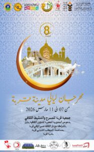 بدعم من المندوبية الجهوية للشؤون الثقافية بنابل تنظم دار الثقافة حسن الزقلي بقربة بالشراكة مع جمعية قربة للمسرح و التنشيط الثقافي مهرجان “ليالي مدينة قربة ” في دورته الثامنة و ذلك من 07الى 11مارس 2026
